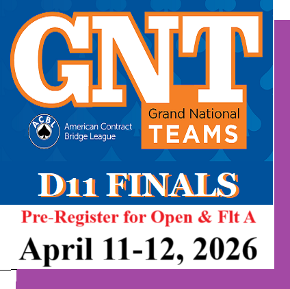 Join us for the District 11 Finals held at the Cincinnati Bridge Club on April 11-12. Flight A and the Open Flight required preregistration. Flight B & C will be played as 1-Day Swiss. If 8 or more teams show up in Flight B & C then the top 2 teams will qualify for the nationals. More info can be found at the district11bridge.com